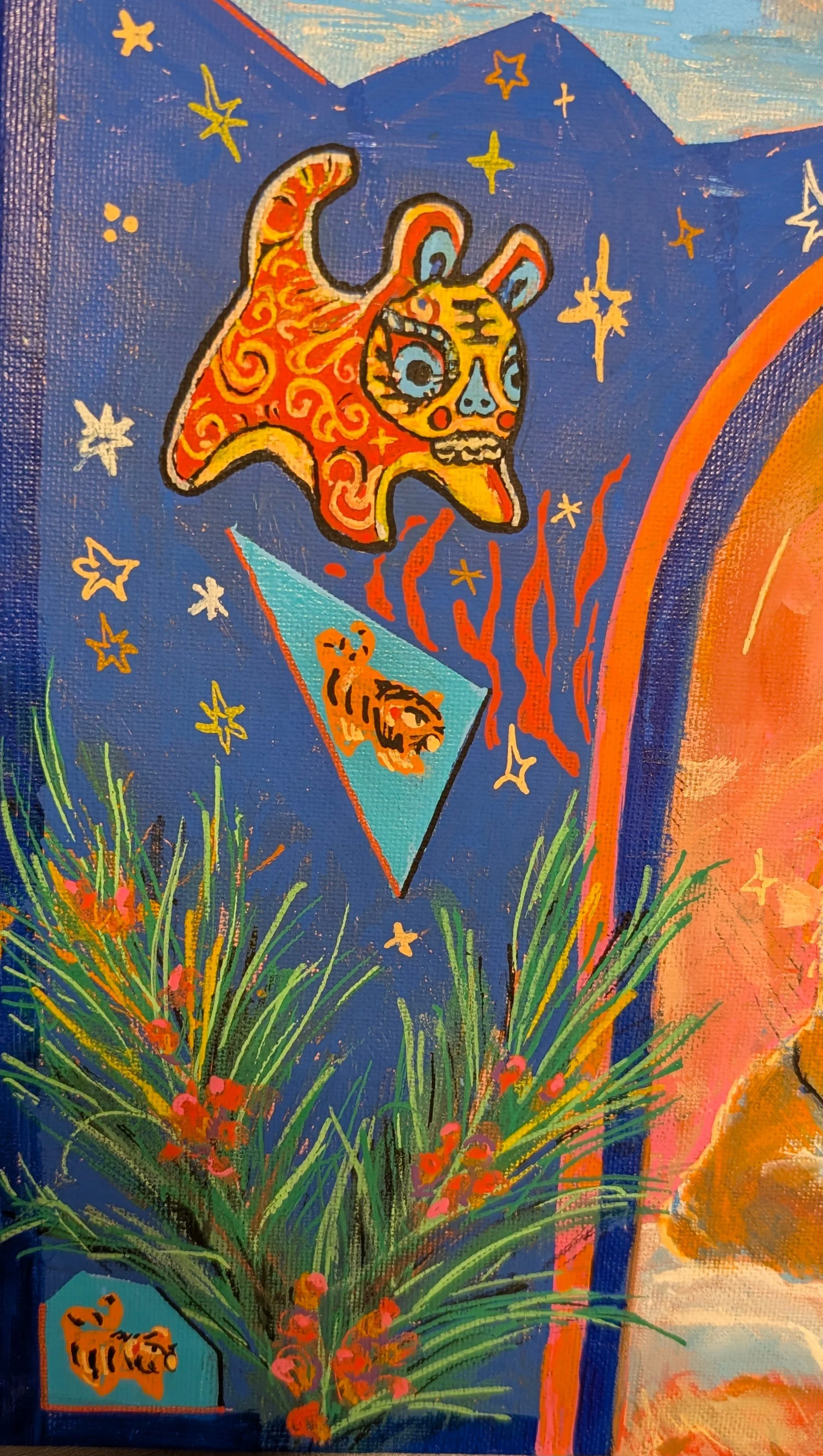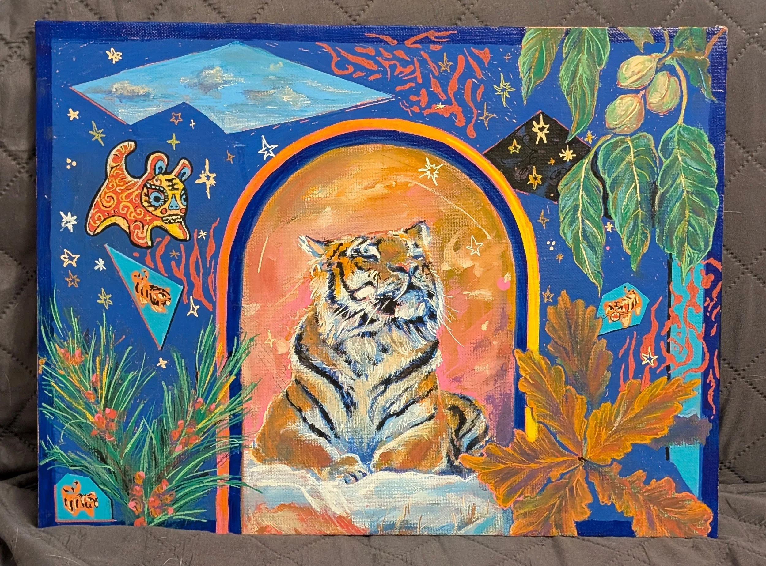 This mural maquette is designed and painted for the Hogle Zoo Mural Project application. Design elements include foliage from native trees, cultural depictions of tiger drawings, segments of sky and hand drawn stars, and red patterns abstracted from tigers’ stripes.
