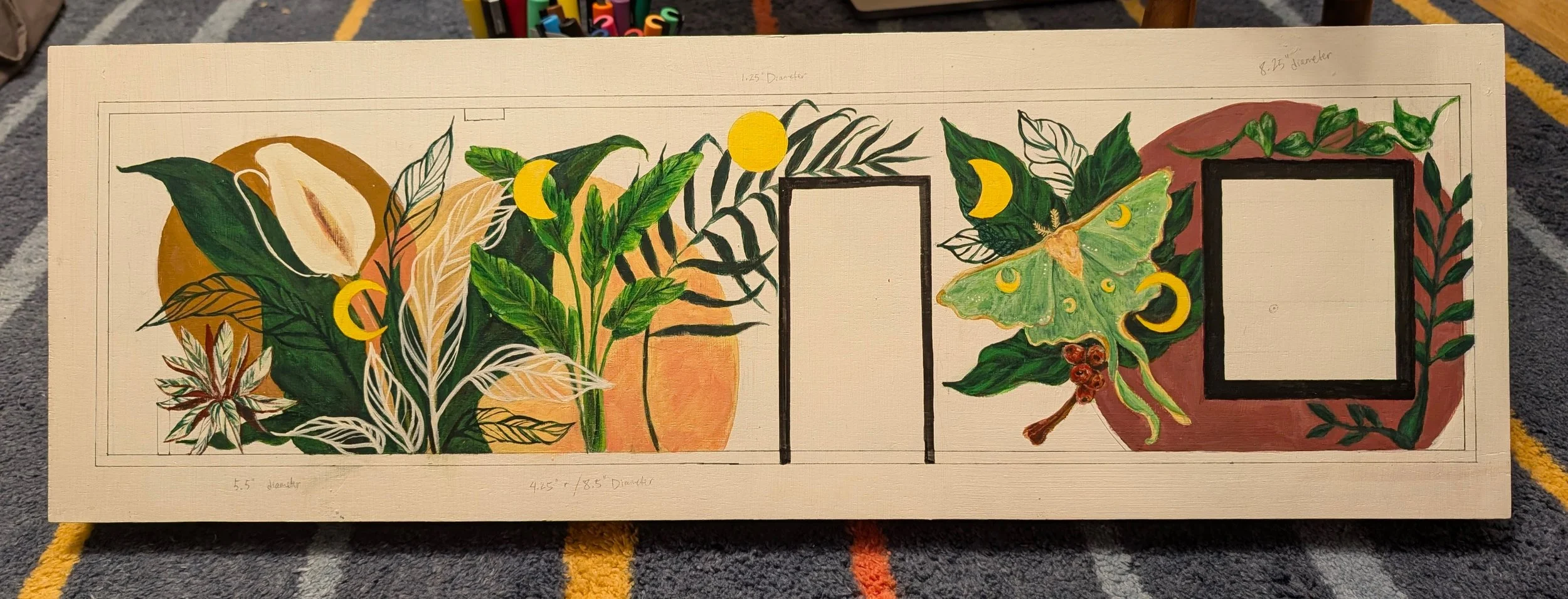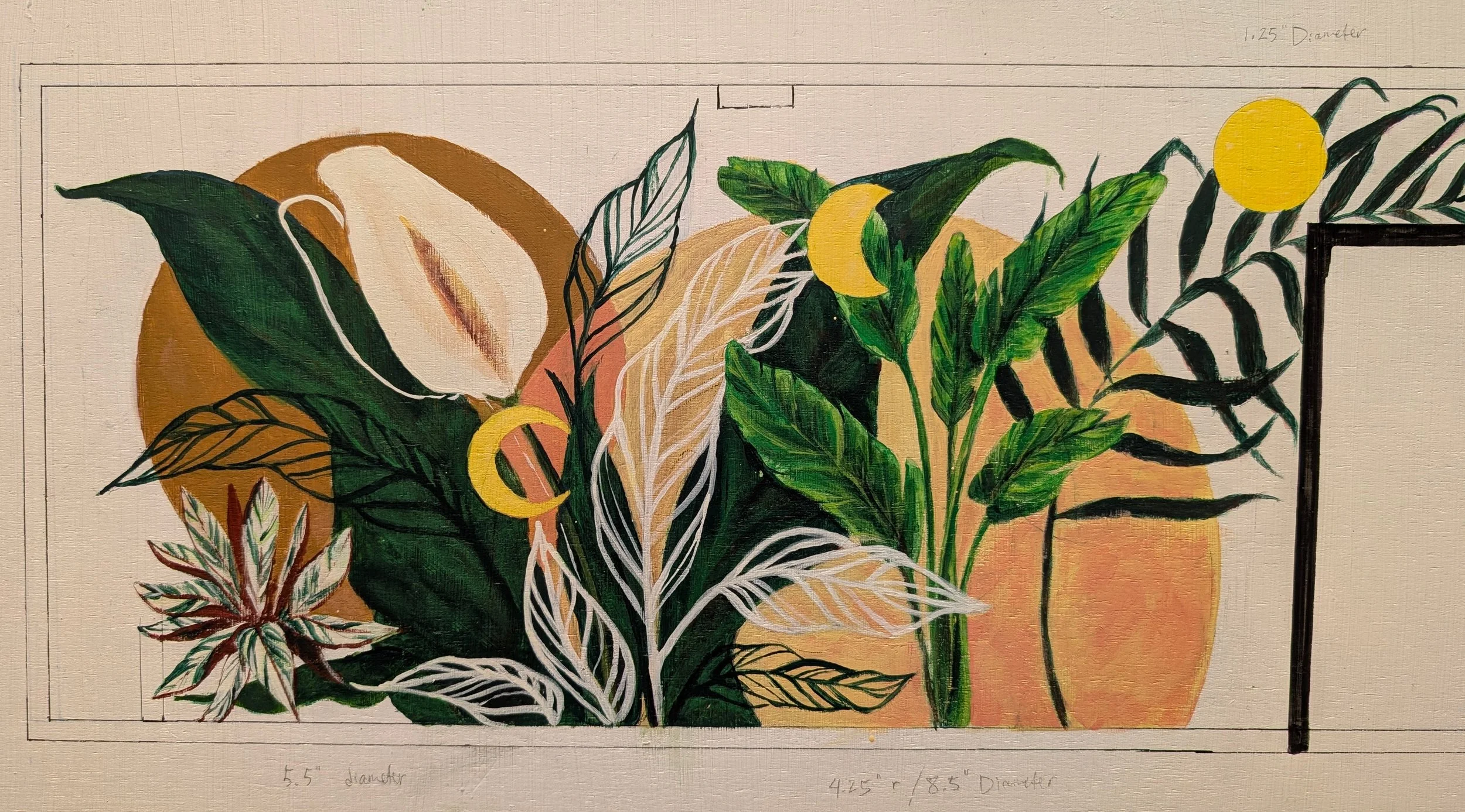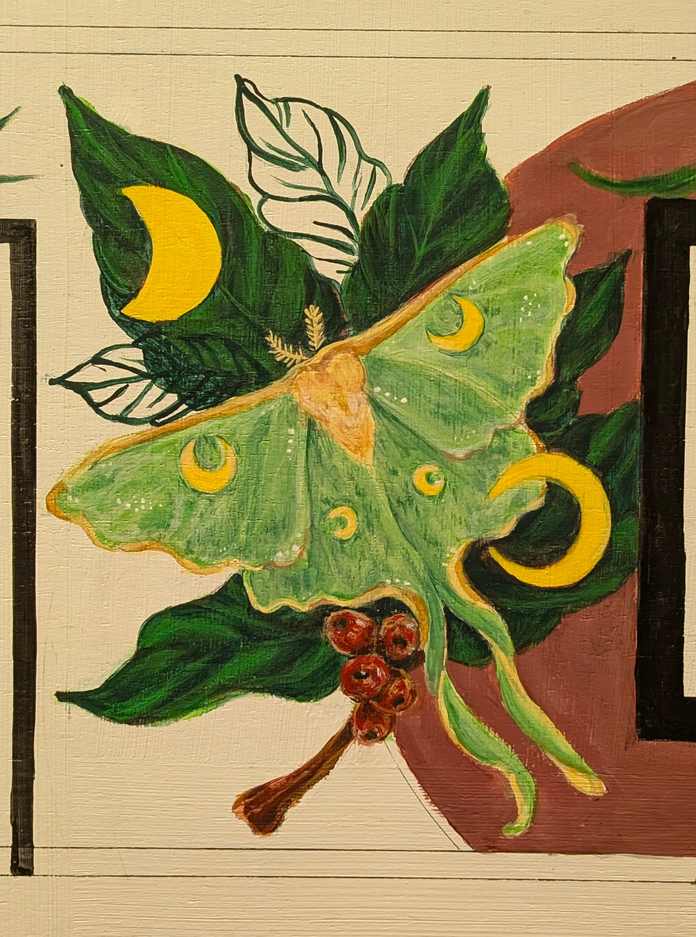 Other design elements include a Luna Moth set against an Arabica coffee plant with coffee berries, phases of the moon, and various plants with symbolism aligned with the owners’ ideals and intentions for their space.