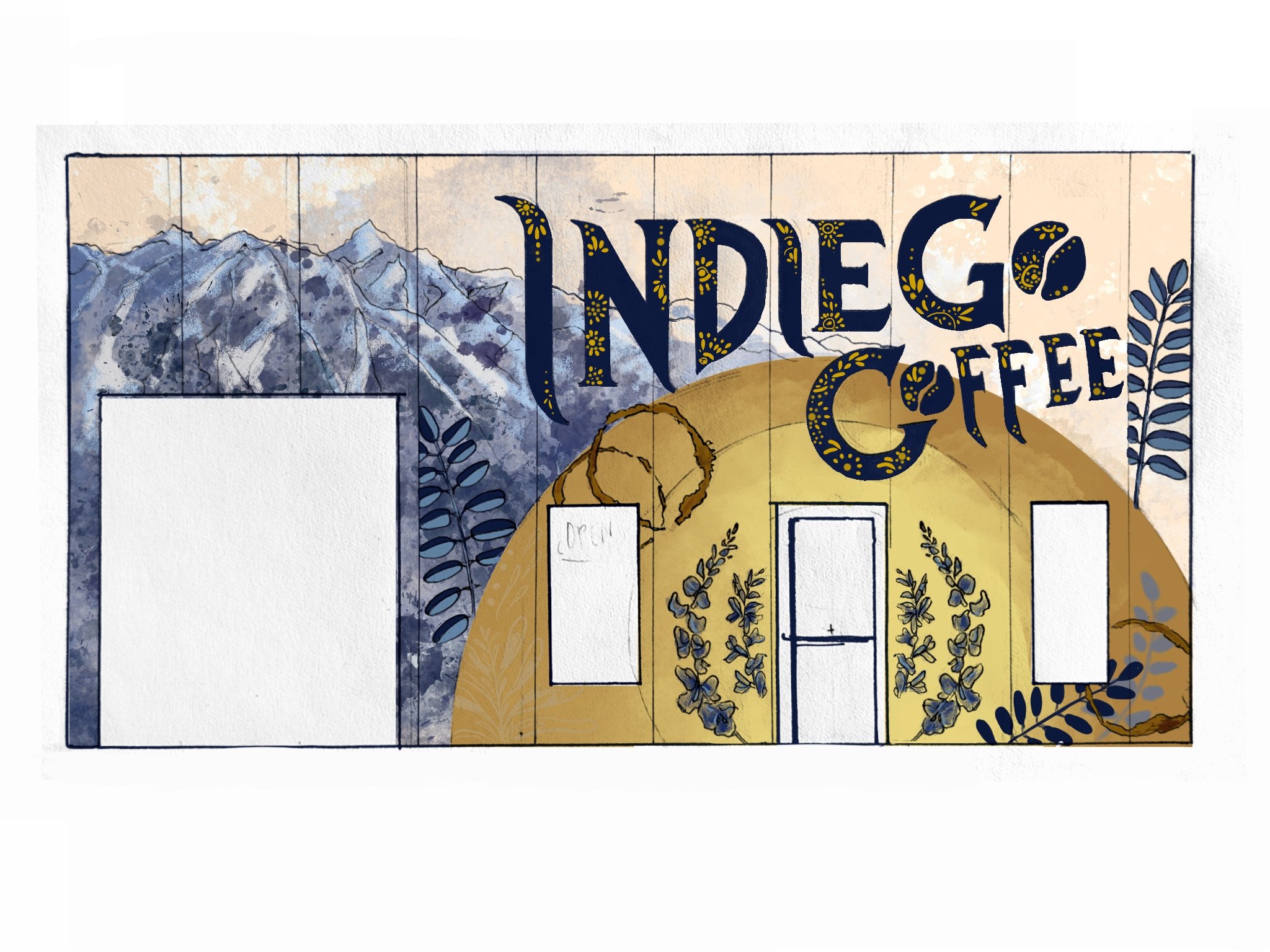This mural design is still in the process of approval. IndieGo Coffee is another a local business, and the owner is Indian American, with strong ties to Utah. The design incorporates our hallmark mountain range, coffee mug rings to represent a place for conversation and gathering, a glowing sun around the entrance, patterns inspired by traditional Indian henna as a subtle homage to the owner’s heritage, and the foliage and flowers of the indigo plant, from which the business draws its name.