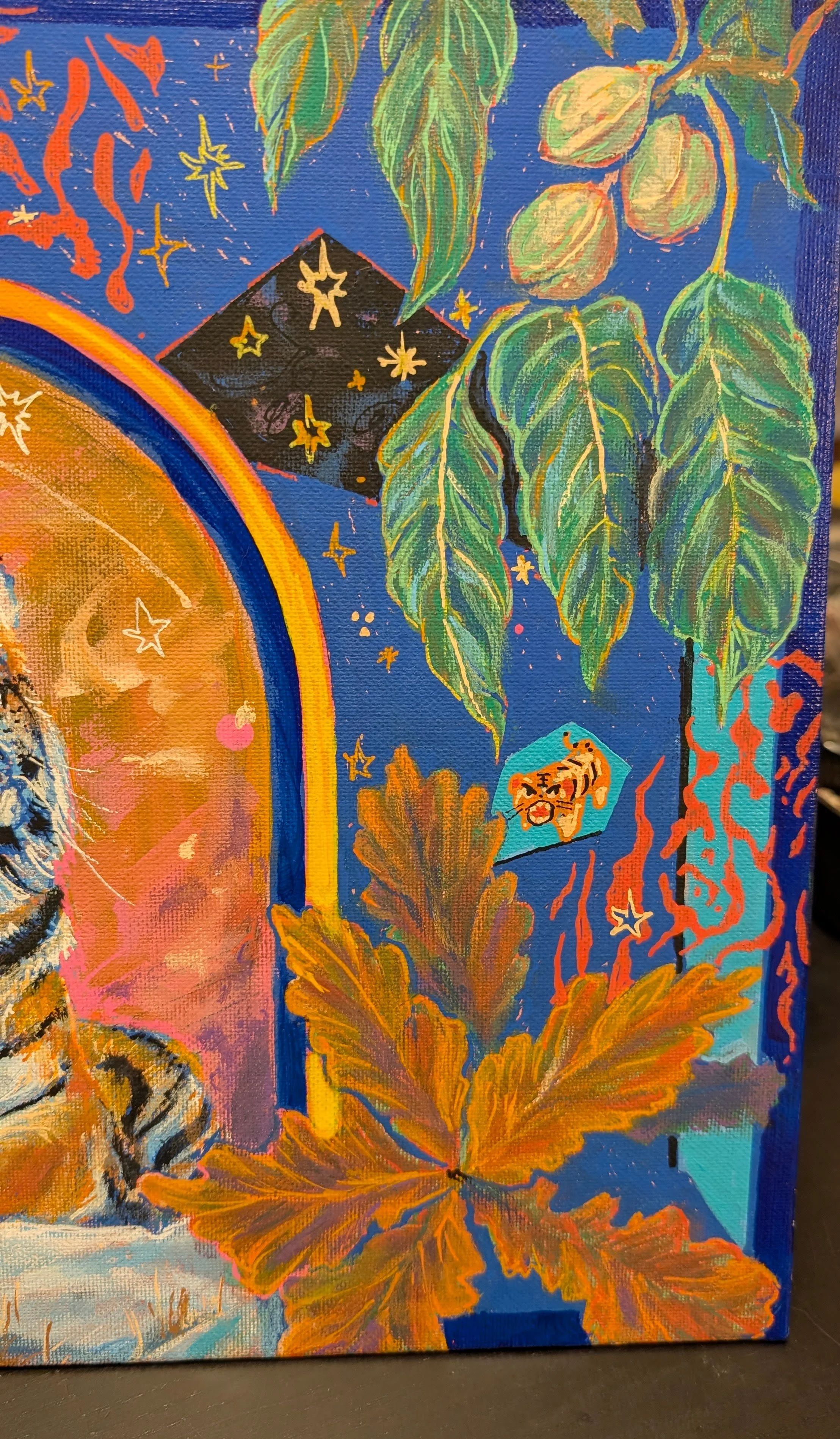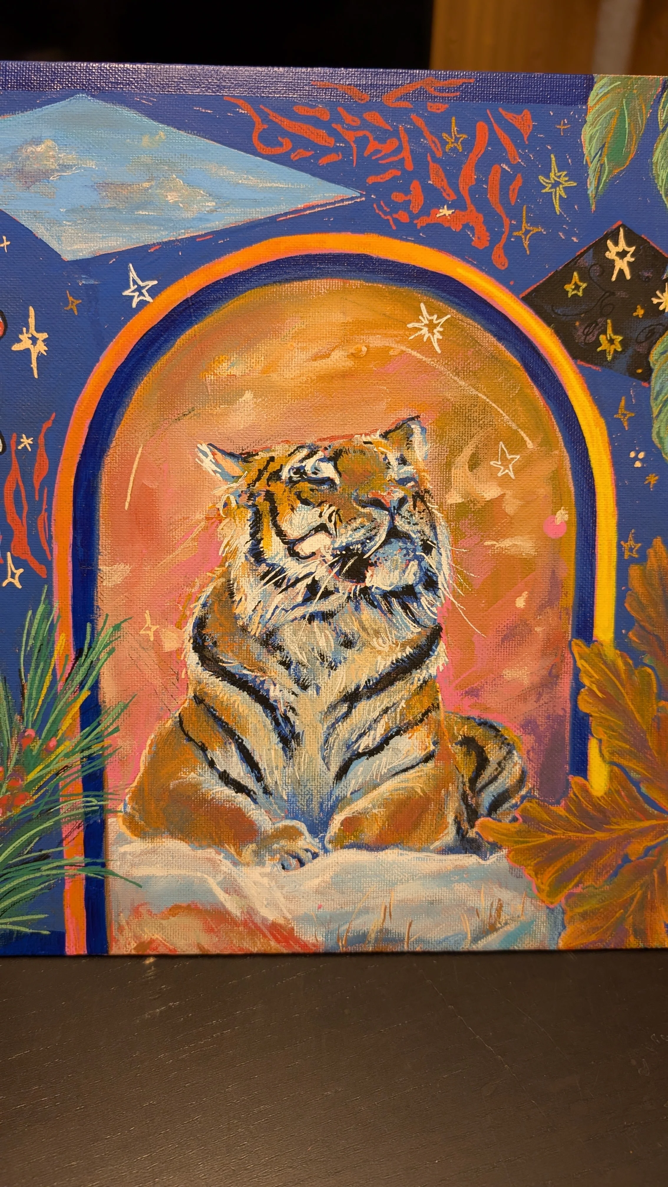 Keeping Hope Alive: While conservation efforts have kept the wild population stable in recent years, deforestation and habitat fragmentation are serious threats, and Amur Tigers remain classified as an endangered species. Fragments of sky represent a dream for freedom in the natural world for the tigers. Hand drawn stars also represent wishes, from a place of child-like wonder. While the risk of extinction for such a beautiful creature is a frightening and dire thing to contend with, all of us must continue believing in the magic of the natural world in order to enact change for a better future.